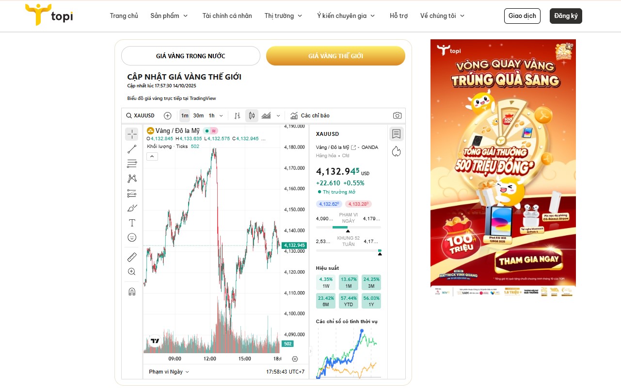 Giá vàng thế giới vừa thiết lập cột mốc lịch sử khi vượt ngưỡng 4.100 USD/ounce, đánh dấu một trong những đợt tăng mạnh nhất trong nhiều năm qua. Diễn biến này phản ánh tâm lý lo ngại rủi ro của giới đầu tư toàn cầu trước biến động kinh tế, địa chính trị và xu hướng nới lỏng chính sách tiền tệ từ các ngân hàng trung ương. Tuy nhiên, câu hỏi lớn được đặt ra là: Liệu đây có phải là “đỉnh mới” của vàng, hay chỉ là một nhịp tăng ngắn hạn trước khi thị trường điều chỉnh?